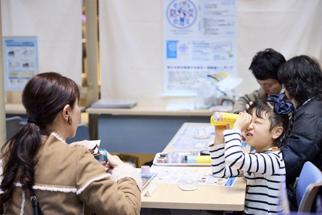 数多くの口腔ケア用品のメーカーとして、水が出ない災害時でも口の衛生を保つことができる「無水ハミガキセット」のPRや、歯ブラシ100グラム計量チャレンジ等のゲームを通して災害時の口腔ケアの大切さを伝えるブースを出展。災害発生に伴う断水など、ついついおろそかにされがちな口腔ケアの重要性を伝えており、来場者の日頃の備えの中に「ハミガキセット」が加わる機会となったのではないでしょうか。またこのような防災イベントは、ヤマトエスロン社内では毎回異なる部署の社員がスタッフとして出展し、来場者と関わることで、社会貢献活動としても位置付けられているようです。 - ワクワクさんの防災親子工作教室