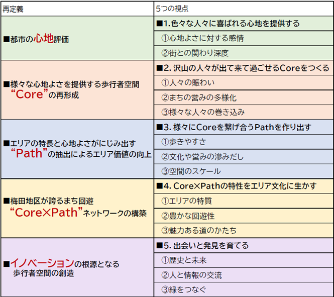 そのために、多様なまちの利用者が感じる「心地」や、賑わいの核となる広場などの「Core」と、通行や滞留ができる街路などの「Path」、それらを結び回遊性を高める歩行者空間「Core×Pathネットワーク」といった重要な観点を「5つの視点」として整理しました。これより梅田地区エリアマネジメント実践連絡会が行う取組みを「5つの視点」に基づきご紹介します。