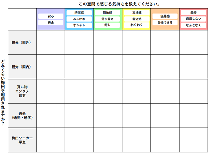 「5つの視点」の1点目は、「色々な人々に喜ばれる心地を提供する」という多様な利用者が感じる「心地」の評価です。観光客やワーカー、学生といった立場や目的の異なる人々が、梅田の各場所でどのような感情を抱いているかを把握することで、より多くの人に喜ばれる魅力的な都市空間の創造に繋げます。