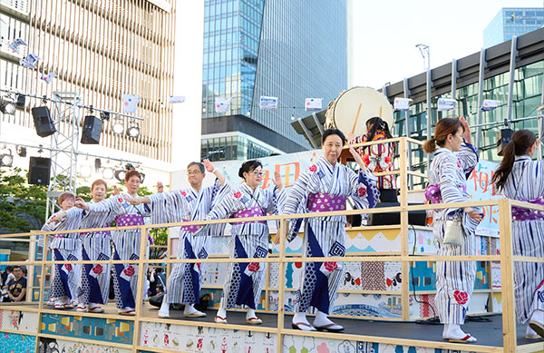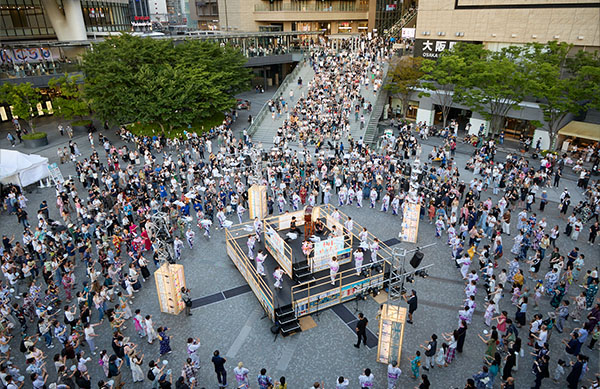 メイン会場となるグランフロント大阪のうめきた広場には、夕方から始まる「ゆかたde盆踊り」を目当てに多くの方々が集まり、都心での盆踊りを楽しみました。櫓を囲み一体となって踊る様子は、まさに「Walkable UMEDA構想」のCoreとして目指す、「人々の賑わい」促進を体現する仕掛けのひとつと捉えています。
