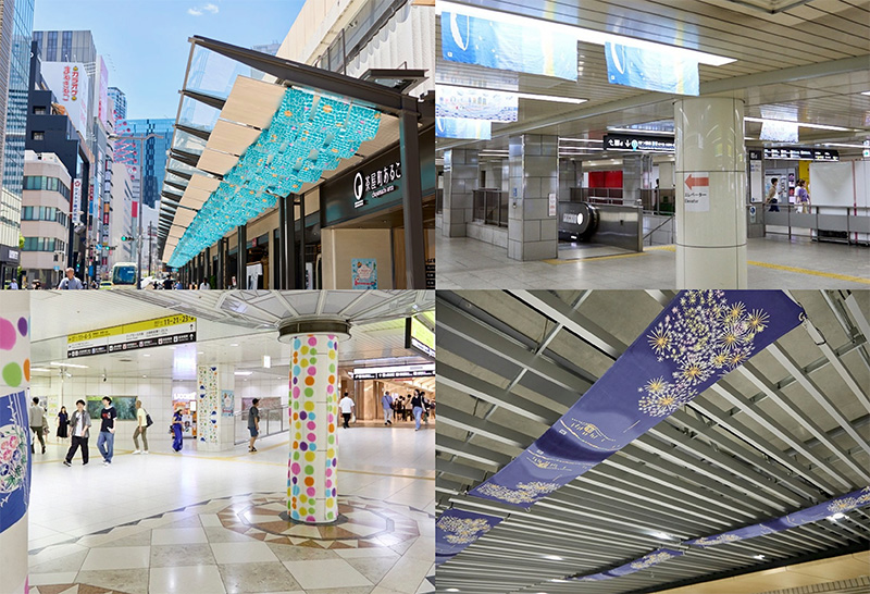 それらを踏まえ「梅田ゆかた祭」では、梅田エリア内の公共的空間11か所で、風情ある手ぬぐい装飾を実施しました。商業施設の歩道沿いや駅構内、地下道や広場等の天井・壁面・吊りサイン等を、統一した装飾展開することにより「催事の一体感」を演出し、移動を楽しんでいただくことを企図しています。