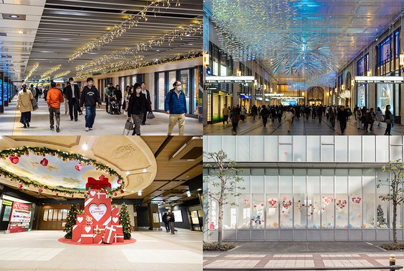 また、メインコンテンツの一つである「HEART SPOT」では、梅田地区の商業施設・ホテル等の47施設が一体となり、ハートやイルミネーション装飾でまちを華やかに彩りました。大阪駅前地下道の中央通路では、「Umeichi Illumination Avenue」と題し、阪神梅田本店のショーウィンドウと連動したイラストとイルミネーションで通路全体を彩りました。慌ただしい日常の中で、ふと見上げる光に安らぎを感じていただけるような地下道を演出しています。この他にも、道沿いや植栽、ビルのガラス面などまちの至る所に「心あたたまるスポット」を創出し、冬のまち歩きを楽しんでいただける仕掛けを行いました。